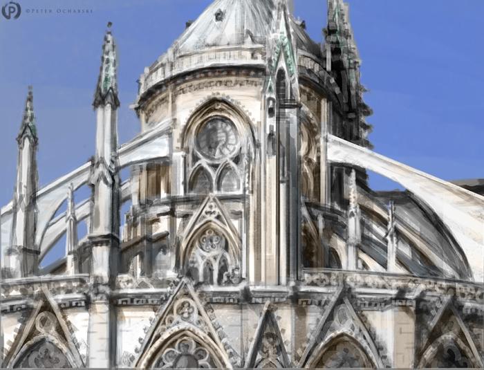 Notre Dame painting, gothic cathedral in France with flying butresses