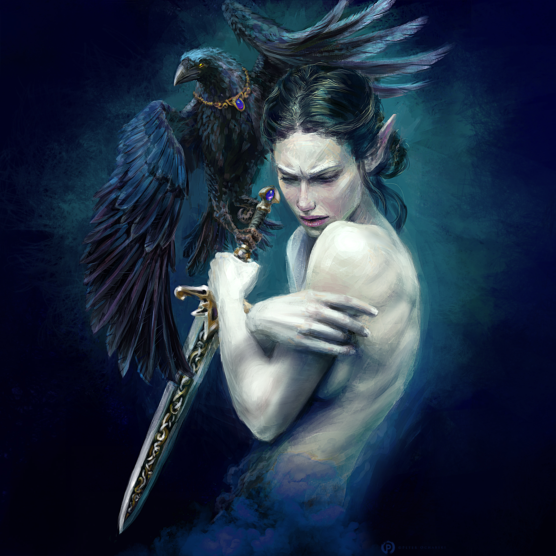 A lot of the changes were using softer brushes to round out and soften appropriate forms, like behind her right arm, her back muscles, forearm and form shadows (not cast shadows v important), added plane changes like on the top of the wing as it transitions away from the light, and on the other wing one person mentioned they though it was a "thumb" so I made that overlap more clear showing the wing extend into the foreground and fleshed it out a bit. Also added the amulet to the bird and put the same gem into the hilt of the sword to bring the storytelling into it and link the two characters visually. Also hardened edges where objects end finally where her torso just kind of ended in unfinished brush strokes I turned that into smoke coalescing emphasize her being in the underworld and a sort of spirit crossing planes. Added miscellaneous details like the engravings/inlays on the sword and glowing wing tips in the light... oh and the color traveling up her back outlining the form and enhancing the color swirl around the composition.