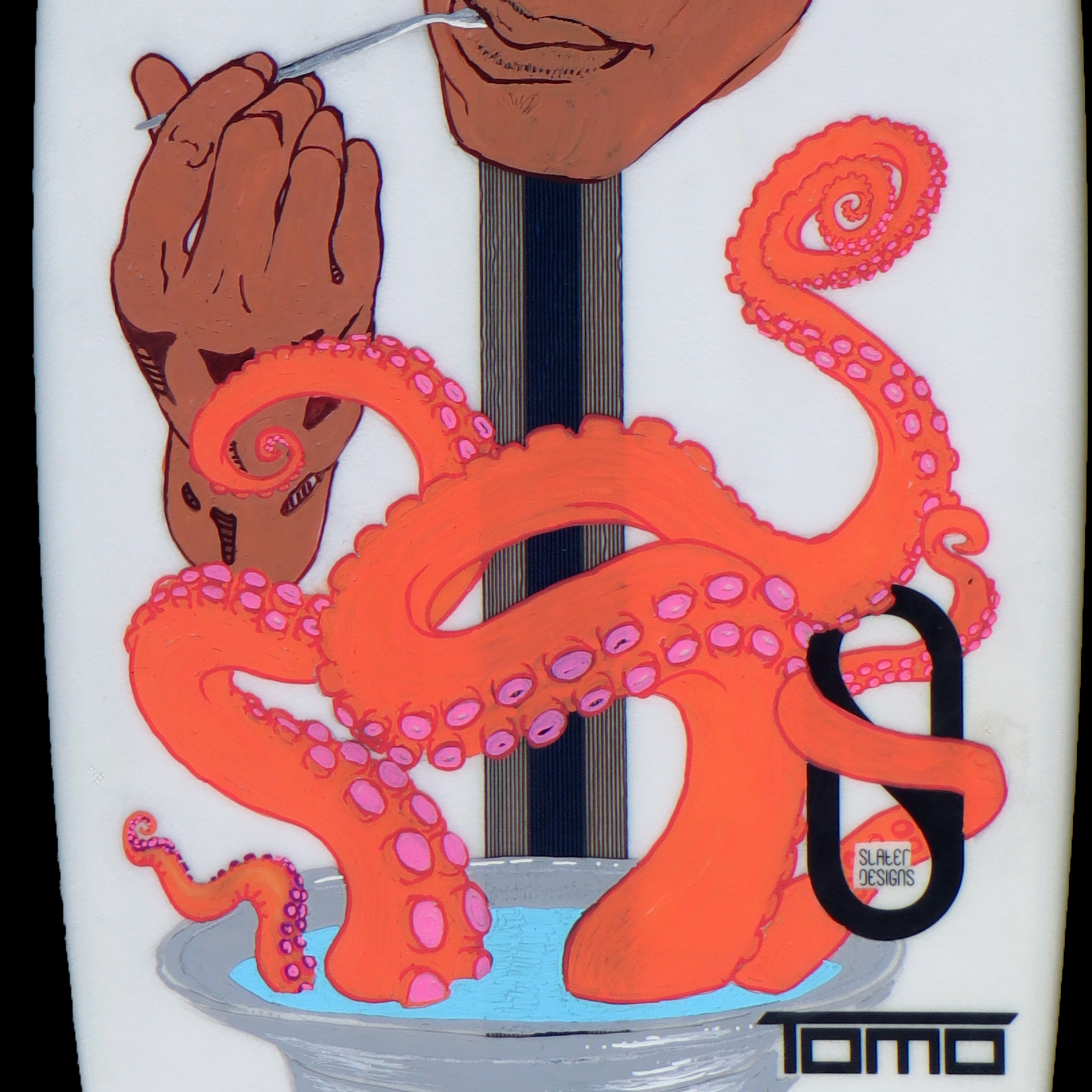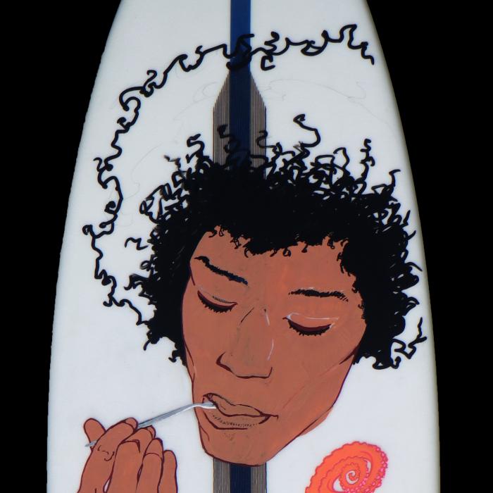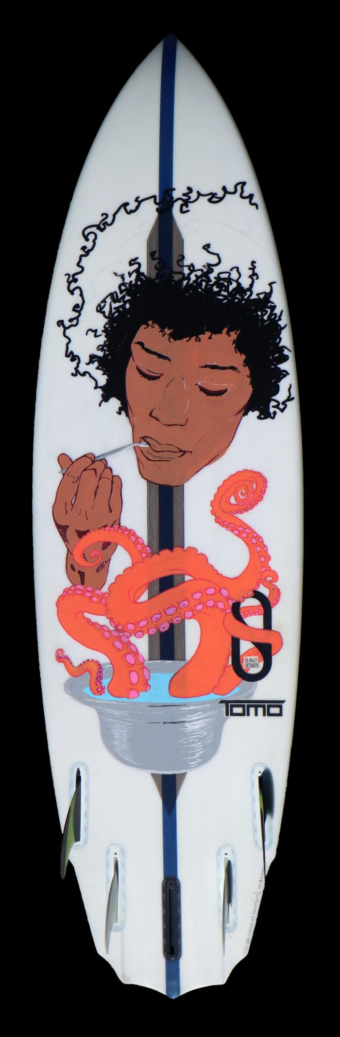The worlds first NFT high performance surfboard you can ride with original hand painted art. The owner of this NFT will receive the surfboard with the original painting as well. The art features Jimi Hendrix from the Voodoo Soup album but with a psychedelic nautical twist. Its painted on a 5'8" Tomo / Slater Designs Sci-fi 2.0 good for riders up to 6'+. The surfboard is the artists personal all time favorite board!